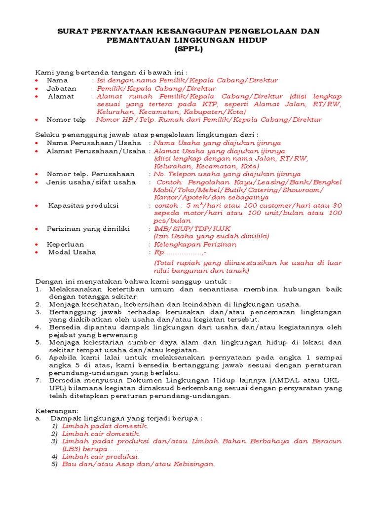 (untuk perseorangan) surat pernyataan kesanggupan pengelolaan dan pemantauan lingkungan hidup (sppl) kami yang 3. Sppl adalah dokumen yang menjadi persyaratan sebelum seorang pelaku usaha memperoleh izin teknis tertentu seperti izin. .kesanggupan pengelolaan dan pemantauan lingkungan hidup (sppl) yang. Surat pernyataan kesanggupan pengelolaan lingkungan (sppl) adalah dokumen lingkungan hidup (dlh) berupa surat yang menyatakan kesanggupan pelaku usaha untuk mengelola dan memantau dampak lingkungan hidup dari kegiatan usahanya. Selaku penanggung jawab atas pengelolaan lingkungan dari: